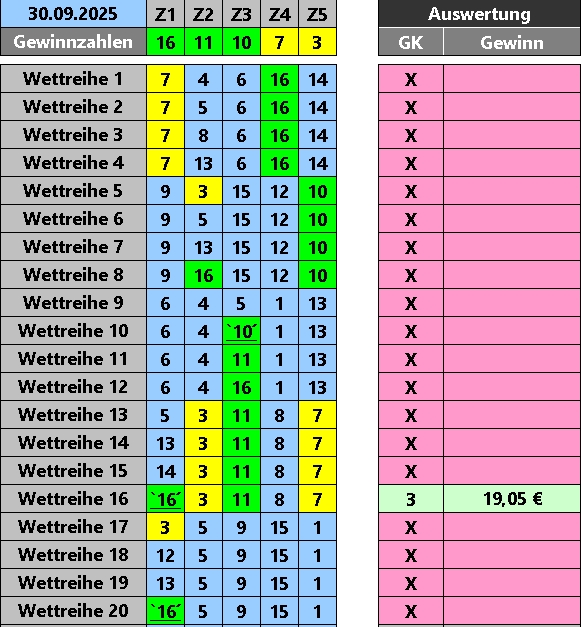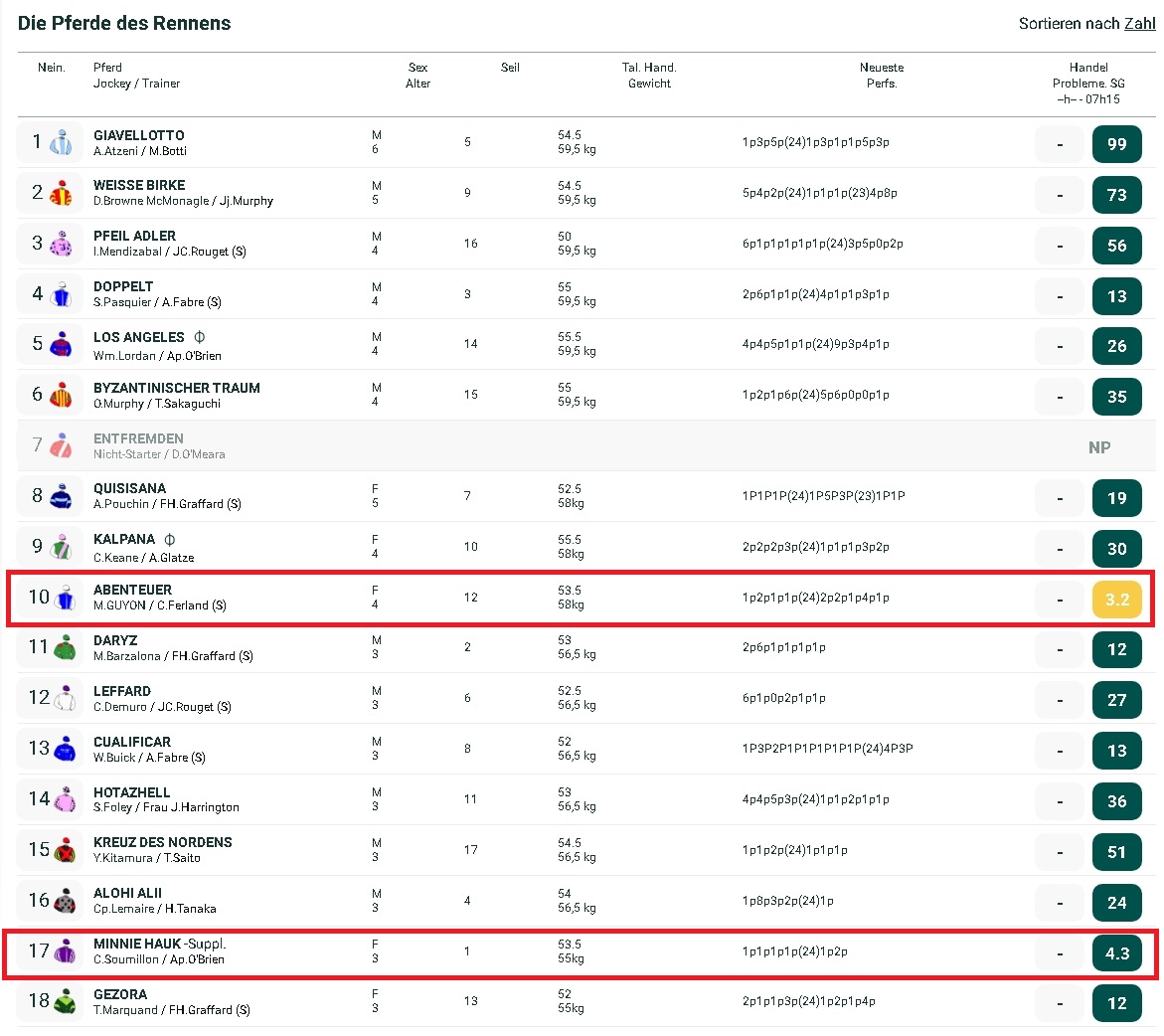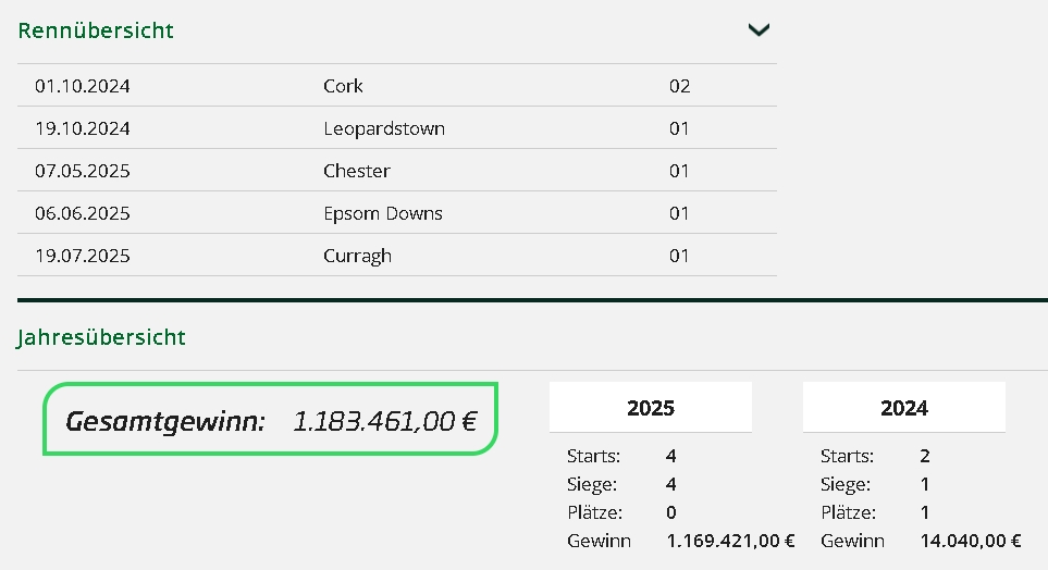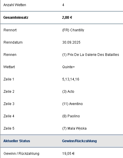 Quinte/Frankreich - Ecart - 05.10.2025 Finde es schon sehr spannend, was da heute um 16:05 Uhr im Quinte Rennen in Longchamp abgeht. JackPot für die Quinte-Wetter => 3.000.000 € 5.000.000 € für die ersten fünf im Zieleinlauf. Rennpreise: 1.] 2.857.000 € 2.] 1.143.000 € 3.] 571.500 € 4.] 285.500 € 5.] 143.000 € Wenige cm entscheiden, ob es 2,8 € Mio. gibt, oder (nur) 1,1 € Mio. Nr. 5 im Zieleinlauf, nun ja, 143.000 €. Wie im Motorsport, müssen die Starter ein hohes Nenngeld zahlen. Zitat:"Die Irin Minnie Hauk (17) aus dem Stall von A. P. O’Brian. Stand - 7:30 Uhr: RE: Permutationen bei Pferdewetten - Quinte/Frankreich - Ecart - 05.10.2025 Soloangriff mit Tool: @Ecart --- Quinté+ Details --- Reihen pro Block: 4 Gesamtreihen: 40 Gesamtkosten: €20.00 --- Eingabeparameter --- A-Pferde (60%): [4, 5, 6, 8, 9, 10, 11, 12, 13, 15, 16, 17, 18] B-Pferde (40%): [1, 2, 3, 14] Gesamt ausgewählte Pferde: 17 Anzahl Blöcke: 10 Block-Strategie: Block-Vielfalt --- Trefferwahrscheinlichkeit für 2. Rang (5 Richtige) --- Anzahl Pferde: 17 | Kombinationen: 6.188 Abgedeckte Kombinationen: 40/6.188 (~0.8% Trefferwahrscheinlichkeit) Exakte Reihenfolge: => 1 : 742.560 |