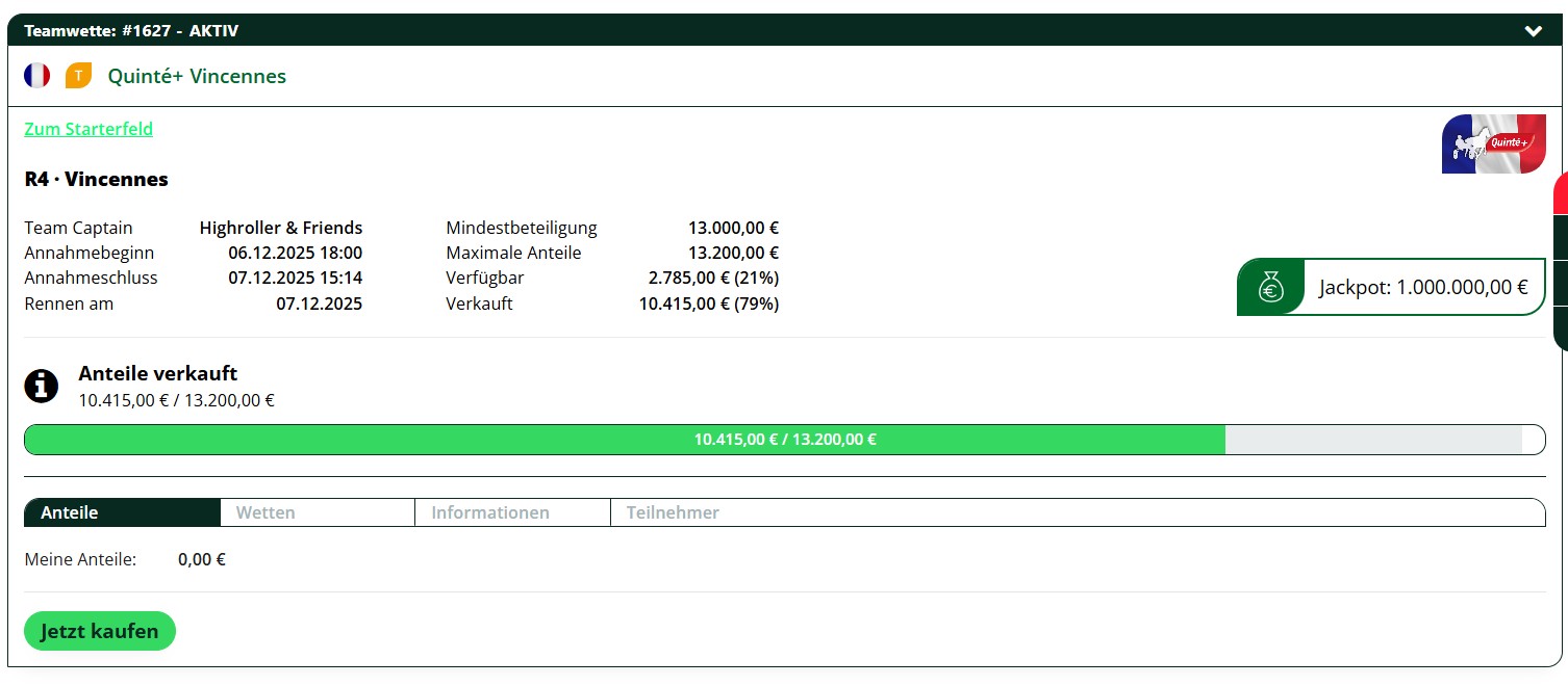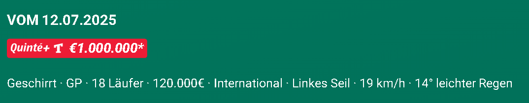 RE: Permutationen bei Pferdewetten - Quinte/Frankreich - Brokerjays - 07.12.2025 Ecart, geht ihr heute an den Start? Teamwette bei wettstar versucht es mit > 10k €. RE: Permutationen bei Pferdewetten - Quinte/Frankreich - Ecart - 07.12.2025 Heute leider Ausfall, PC (Linux) Probleme!!!