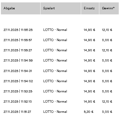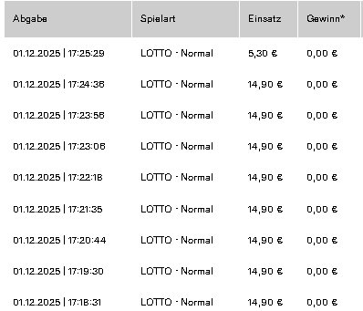 RE: 100 Lottoreihen-49 Lottozahlen-eine SuperZahl - Didi - 01.12.2025 Hallo Ecart Ich bin raus da ich eine andere Strategie habe.Euch weiter viel Glück erlich gemeint. VG.DiDi RE: 100 Lottoreihen-49 Lottozahlen-eine SuperZahl - Ecart - 01.12.2025 + 24,20 € Rücklauf wurde von WestLotto noch nicht bestätigt (10:20 Uhr). € 12,10 Rücklauf TG Teilnehmer : 5 = 2,42 € => 9,58 € Spielbeitrag für Mi. 03.12.2025. @Didi, vielen Dank für dein TG Mitspiel, nach Bestätigung WestLotto, überweise ich => 2,42 € Stand für Mi. 03.12.2025: 1. Gagga ? 2. Karate; dabei 3. Brokerjays ? 4. Oli ? 5. Ecart/72 € RE: 100 Lottoreihen-49 Lottozahlen-eine SuperZahl - Didi - 01.12.2025 Hallo Jürgen 2,42€ in Deiner Kaffekasse alles gut. DiDi
