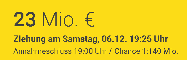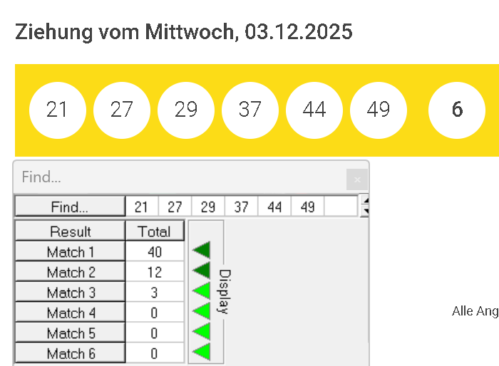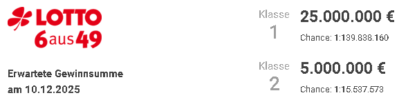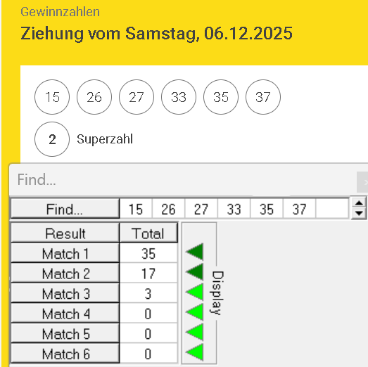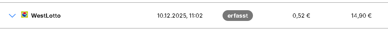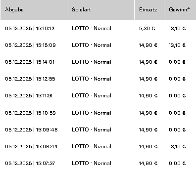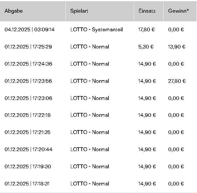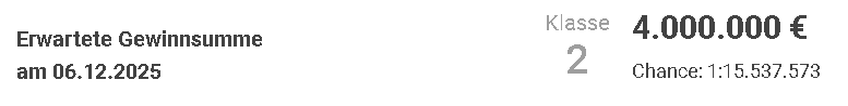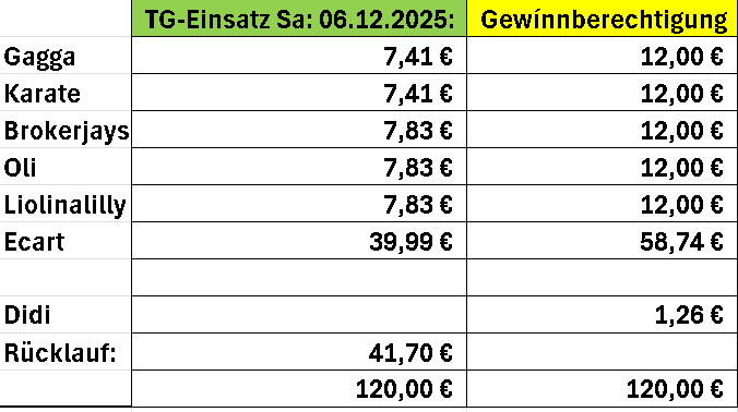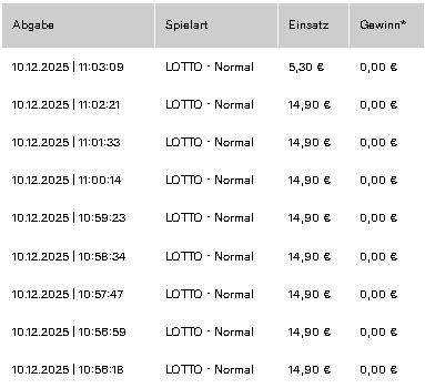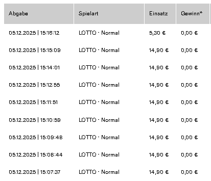 RE: 100 Lottoreihen-49 Lottozahlen-eine SuperZahl - Ecart - 04.12.2025 (01.12.2025, 18:38)Ecart schrieb: 1. Gagga; 9,58 € (13,21 €) Wieder 3 mal => 3er | WestLotto Bestätigung folgt Wenn JP, läuft TG-Angebot weiter, mit SZ: 3 @Didi, dein € Minirücklauf wird selbstverständlich wieder gewinnberechtigt eingesetzt. RE: 100 Lottoreihen-49 Lottozahlen-eine SuperZahl - Ecart - 04.12.2025 Sa.: 06.12.2025 Genauer € Spieleinsatz folgt: 12 € minus Rücklauf => --,-- € 1. Gagga; 2. Karate; 3. Brokerjays; 4. Oli; 5. Didi; 6. Liolinalilly: 7. Ecart; Rest incl. Gebühren Nikolaus-Sonderauslosung, die am 03. Dezember und 06. Dezember 2025 stattfindet, winken insgesamt zusätzliche 4 Millionen Euro. Alle Spieler, die am Mittwoch, den 03.12. und/ oder Samstag, den 06.12. 3 Richtige (Gewinnklasse 8) erzielen, nehmen automatisch teil. Die Gewinner der Sonderauslosung werden am 08.12.2025 ermittelt und anschließend hier bekanntgegeben. Spielauftragsnummer: 9101-66268689-074238 9101-48106256-071638 RE: 100 Lottoreihen-49 Lottozahlen-eine SuperZahl - Ecart - 04.12.2025 (04.12.2025, 10:04)Ecart schrieb: Sa.: 06.12.2025 12 € minus Rücklauf (4,17 €) => 7,83 € € 41,70 : 2 = 20,85 € : 5 TG-TN = + 4,17 € RE: 100 Lottoreihen-49 Lottozahlen-eine SuperZahl - Ecart - 04.12.2025 Wenn weiter dabei, sonst mache ich Überweisung => Rücklauf 100 Reihen/eine SuperZahl Real war der Rücklauf für 3er => 1 : 78 RE: 100 Lottoreihen-49 Lottozahlen-eine SuperZahl - Ecart - 04.12.2025 Erster Zahlungseingang für diese TG: Hier wird dann aktualisiert! 1. Gagga; + 7,41 €/12 € bez. 2. Karate; + 7,41 €/12 € bez. 3. Brokerjays; + 7,83 €/12 € bez. 4. Oli; Verrechnung 5. Didi; dabei; durch 2 mal Rücklauf - ohne weitere Zahlung 6. Liolinalilly: + 8,00 (7,83) €/12 € bez. 7. Ecart; Rest incl. Gebühren RE: 100 Lottoreihen-49 Lottozahlen-eine SuperZahl - Ecart - 07.12.2025 (wieder) 3 mal => 3er-Treffer. Wenn JP steht, geht es so weiter. Wenn JP "fällt" gebe ich 50 Reihen; alle 49 Zahlen ab. 60 € ohne "Gebühren" (= 50 % Ecart). Biete dann für die aktuellen TG-TN, 5 x TG-Mitspiel für 6 € minus Rücklauf an. PS: Lotto Braun; 100 Reihen; 30 TG-Teilnehmer; ebenfalls 3 mal => 3er RE: 100 Lottoreihen-49 Lottozahlen-eine SuperZahl - Ecart - 08.12.2025 + 39,30 € Rücklauf! => 3 mal => 3er - 8,07 € | Spielbeitrag da JP | 60 € - 19,65 € [Rücklauf] : 5 = 8,07 € @didi; du bist weiterhin dabei noch mit + 0,41 €; aus 3. Rücklauf; bei 6er; solo, ~ 17.000 € 1. Gagga; /12 € 2. Karate; 8,07 € bez./12 € 3. Brokerjays; 8,07 € bez./12 € 4. Oli; 8,07 € bez./12 € 5. Liolinalilly: 8,07 € bez./12 € | 3,93 € meine Rücküberweisung === # Didi; dabei; durch 3 mal Rücklauf - ohne weitere Zahlung! 6. Ecart; Rest incl. Gebühren SuperZahl => 3 (100 Reihen) RE: 100 Lottoreihen-49 Lottozahlen-eine SuperZahl - Brokerjays - 08.12.2025 Danke Ecart ! 8,07 € sind raus. Irgendwann muss die SZ 3 mal kommen. RE: 100 Lottoreihen-49 Lottozahlen-eine SuperZahl - Ecart - 10.12.2025 "All-in" RE: 100 Lottoreihen-49 Lottozahlen-eine SuperZahl - Ecart - 10.12.2025 (20.11.2025, 19:37)Ecart schrieb: Keine Gebühren für TG-Mitspieler! | trage ich, ohne Gewinnberücksichtigung. Warum mache ich das? Habe nichts zu verschenken, es soll fair sein. Die "Gebühren"; 0,50 € je Schein erhalte ich über Cashback zurück. Klar habe ich keine Lust mit "klicken" 600 Zahlen in diesen 100 Reihen zu aktivieren. Lösung: => ansehen |