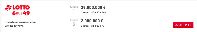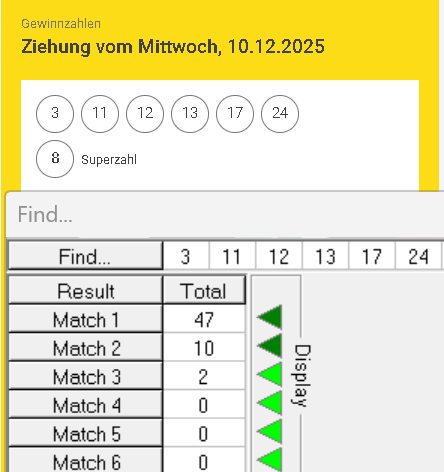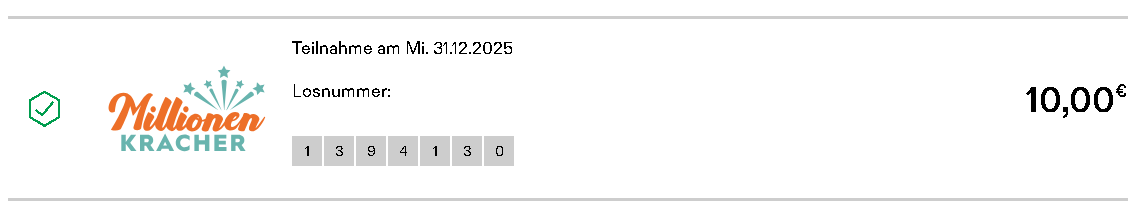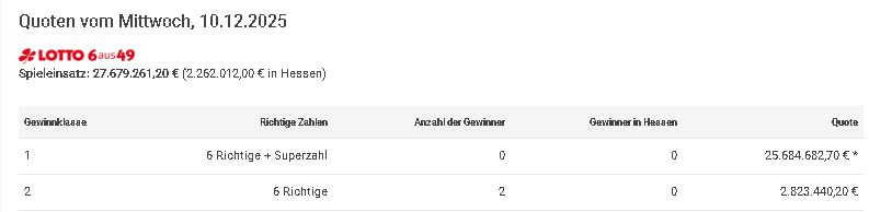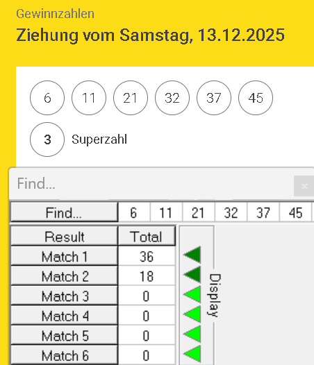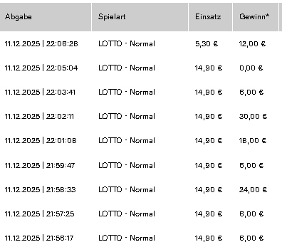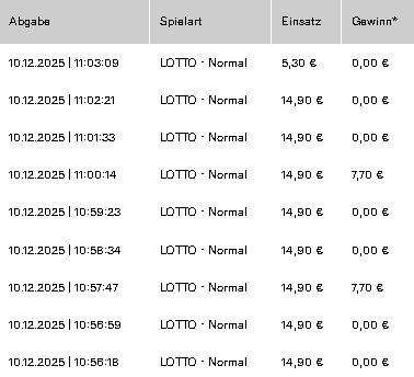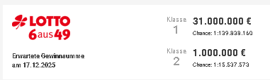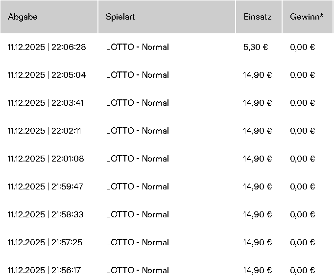 RE: 100 Lottoreihen-49 Lottozahlen-eine SuperZahl - Ecart - 10.12.2025 2 mal => 3er-Treffer Bei dieser Ziehungsreihe gehe ich von 6er-Treffer aus? RE: 100 Lottoreihen-49 Lottozahlen-eine SuperZahl - Ecart - 11.12.2025 + 15,40 € Rücklauf. "10,46 € Spielbeitrag", für die Ziehung, jetzt am Sa. 13.12.2025 | 7,70 € : 5 = + 1,54 € Rücklauf, somit: 12,00 € - 1,54 € => 10,46 € 1. Gagga; 2. Karate; 12 € (Überweisung incl. Rücklauf) 3. Brokerjays; 12 € (Überweisung incl. Rücklauf) 4. Oli; "Verrechnung" 5. Liolinalilly; 5. Ecart, 50 % Spieleinsatz/TG-Organisator === # Didi; (noch) dabei; durch 4 mal Rücklauf in Folge !!! - ohne weitere Zuzahlung! | + 0,06 € => bei 6er+SZ => ~ + 12.500 € - ohne Gewähr - !!! | genaue Abrechnung erfolgt nur bei Supertreffer - aus meinem "€ Gewinn" dieser TG! RE: 100 Lottoreihen-49 Lottozahlen-eine SuperZahl - Ecart - 12.12.2025 Mathematisch ist unsere 1 zu Chance besser als beim Millionenkracher (NRW) den es immer noch zu kaufen gibt! Deshalb für die treuen TG-TN | 100 Lottoreihen-49 Lottozahlen-eine SuperZahl | mein Sponsi - Gewinnverteilung wie TG. RE: 100 Lottoreihen-49 Lottozahlen-eine SuperZahl - Ecart - 13.12.2025 + 108 € => nur ! 18 x 2er + SZ 100 Lottoreihen-49 Lottozahlen-eine SuperZahl - Ecart - 16.12.2025 + 108 € Rücklauf - 6 € => "Sponsi" aber nur bei Teilnahme - Abstimmung => SuperZahl! | weiterhin jeweils 10 % Gewinn-Anteil der TG-TN. Abstimmung: JEDER TG-Teilnehmer - MUSS - eine SuperZahl für die Ziehung, jetzt Mi. 17.12.2025 abgeben! Wer keine SZ abgibt, dem werden die 1,20 € [aus "Sponsi"] vom nächsten "Rücklauf" abgezogen! 1. Gagga; 9 2. Karate; 1 3. Brokerjays; 4 4. Oli; 5. Liolinalilly; 3 5. Ecart; 0 RE: 100 Lottoreihen-49 Lottozahlen-eine SuperZahl - Gagga - 16.12.2025 Moin! Bin für die "9". RE: 100 Lottoreihen-49 Lottozahlen-eine SuperZahl - Brokerjays - 16.12.2025 #4 ist meine Wahl RE: 100 Lottoreihen-49 Lottozahlen-eine SuperZahl - Didi - 16.12.2025 Didi War ein versehen bin nicht dabei RE: 100 Lottoreihen-49 Lottozahlen-eine SuperZahl - Karate - 16.12.2025 Wäre für die 1 RE: 100 Lottoreihen-49 Lottozahlen-eine SuperZahl - Liolinalilly - 16.12.2025 Die 3 war lange nicht ,jetzt öfter, wetten bin für die 3 |