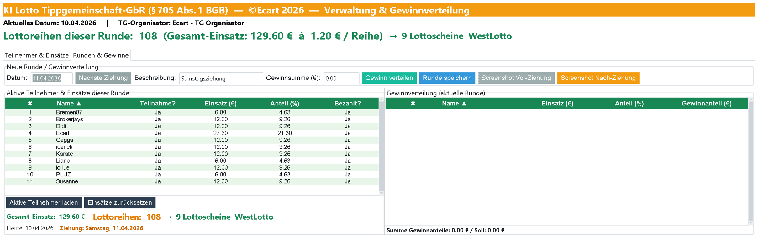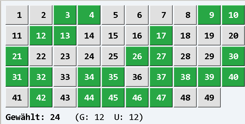 RE: 12 € TG-Einsatz - Lotto 6aus49 - KI Lotto Tool ©Ecart 2026 - Bremen07 - 09.04.2026 Bin auch dabei! 12 € TG-Einsatz - Lotto 6aus49 - KI Lotto Tool ©Ecart 2026 - Ecart - 10.04.2026 Perfekt folgt noch... RE: 12 € TG-Einsatz - Lotto 6aus49 - KI Lotto Tool ©Ecart 2026 - Ecart - 10.04.2026 Fehlt was? RE: 12 € TG-Einsatz - Lotto 6aus49 - KI Lotto Tool ©Ecart 2026 - Ecart - 11.04.2026 3G/3U (nur) 4 Treffer => 17-32-34-46 > 3 mal => 3er RE: 12 € TG-Einsatz - Lotto 6aus49 - KI Lotto Tool ©Ecart 2026 - Thomas360 - 11.04.2026 Edit: Upps, zu spät. ![]() Bei einer Wiederholung, gerne mit 6€ dabei - wenn Platz ist. |