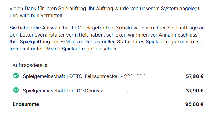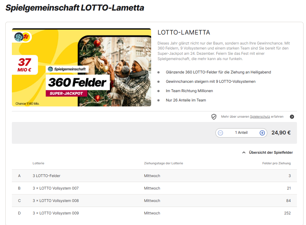 TG "VORFREUDE" - 2 x L24-Spielgemeinschaft - 4 TN möglich - Liane - 19.12.2025 alle,4 weitere Teilnehmer möglich für folgendes Angebot "VORWEIHNACHTS-TG VORFREUDE", beinhaltet die folgenden zwei Lotto24 Spielgemeinschaften: GESAMTEINSATZ = 95,80 Euro : 1. Thomas360 - bezahlt ![]() 2. Lotto-123456+7 - bezahlt ![]() 3. Didi - bezahlt ![]() 4. PLUZ - bezahlt ![]() 5. Liane - Kasse = 19,16 Euro Einsatz / TN im evtl. Gewinnfall zu je 1/5tel anteilig vom Gewinnanteil der o. g. Spielgemeinschaften pro TN Belege werden per Mail zugesandt. Wer traut sich ![]() VG, Liane