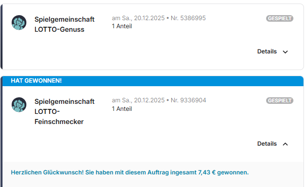RE: TG "VORFREUDE" - 2 x L24-Spielgemeinschaft - 4 TN möglich - Liane - 19.12.2025 4 "Mutige" sind dabei ![]() TG GESCHLOSSEN - uns viel Glück RE: TG "VORFREUDE" - 2 x L24-Spielgemeinschaft - 4 TN möglich - Didi - 19.12.2025 Hallo Immer die selben ![]() DiDi Hallo Wenn man bedenkt wie viel Leute hier in Forum gemeldet sind, und eine Handvoll nur aktiv ist, kann ich manchmal nicht nach vollziehen. Schnüffeln die bloß hier rum. DiDi RE: TG "VORFREUDE" - 2 x L24-Spielgemeinschaft - 4 TN möglich - Liane - 22.12.2025 "VORFREUDE-TGler"unser SA-Gewinn ist leider etwas "mager" ausgefallen mit insgesamt 7,43 Euro: @Thomas360, Lotto-123456+7, Didi und PLUZ wenn Ihr wollt, folgende Teilnahme für Heiligabend: 4 x L24 TG "LAMETTA" für insgesamt 99,60 Euro, abzügl. 7,43 Euro Gewinn = 92,17 Euro und somit 18,43 Euro Einsatz / TN Teilnahme NUR, wenn Ihr damit einverstanden seid, dass ich Euch die Tipps wegen feiertagsbedingtem Zeitmangel erst NACH der Ziehung zusenden werde und kann. Gebt an dieser Stelle kurz Rückmeldung. VG, Liane