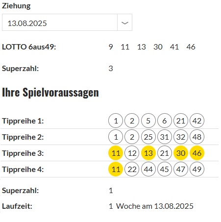 (07.08.2025, 07:24)PLUZ schrieb:(05.08.2025, 13:28)PLUZ schrieb: Lotto Ziehung am Mi 06.08.2025
