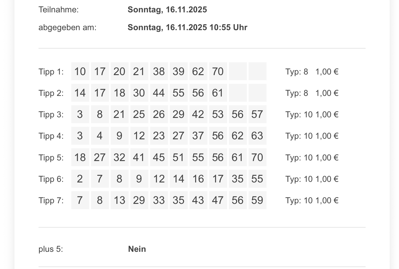 Alle Zahlen hier und per Mail ( Originalspielquittungen LOTTO Hessen )