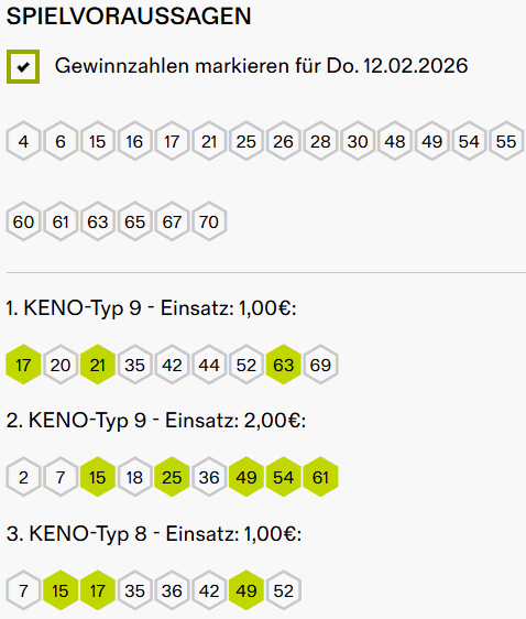 Keno Ziehung Di. 10.2.2026