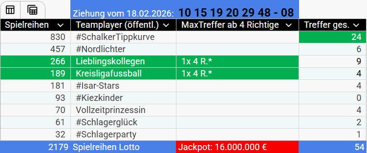 *#SchalkerTippkurve *#Nordlichter *#Isar-Stars *Lieblingskollegen *#Schlagerglück *#Schlagerparty Glückwunsch an den TP "#Schlagerglück". ![]() Hier war ich mit Beteiligung (= 1 Feld).... ![]() Update: Eine Spielerin mit 48 Felder Beteiligung im TP "#Schlagerglück" Die Spielerin, die 5 Richtige erzielt hat, immerhin noch mit 10 Felder Beteiligung...