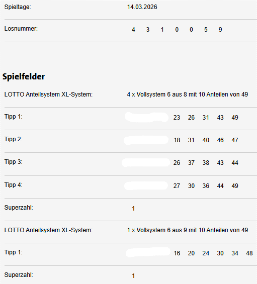 Von meinen 10 von 49 Anteilen an fünf Vollsystemen (4 x 008 und 1 x 009 = 186 Tipps) bei Bayern Lotto stelle ich 6 Anteile á 5,00 € zur Verfügung. Zahlung per Sofort-Überweisung auf mein Konto.